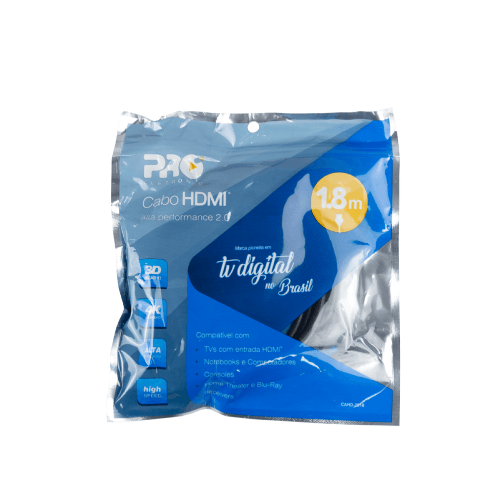 O Cabo HDMI Proeletronic CAHD-2018 oferece alta definição 4K (4096×2160p) e suporte a 3D, ideal para filmes, séries, jogos e transmissões em ambientes domésticos e profissionais. Compatível com TVs, projetores, consoles (PS5, Xbox Series X), notebooks e home theaters, garante áudio e vídeo fluidos com velocidade HDMI 2.0 de até 10,2 Gbps.